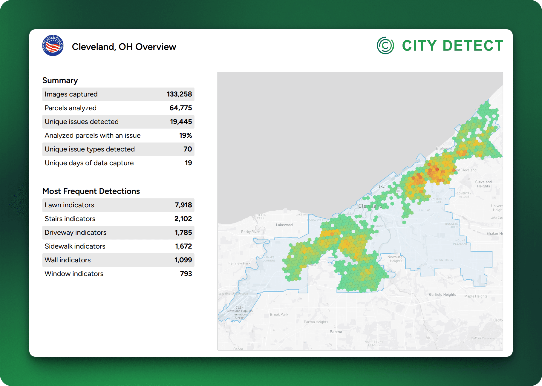Code enforcement teams working with City Detect don't just get a snapshot. They get a living dataset that updates with every fleet pass, giving administrators a continuously current picture of conditions across every neighborhood — the ones where people call in complaints and the ones where they don't.