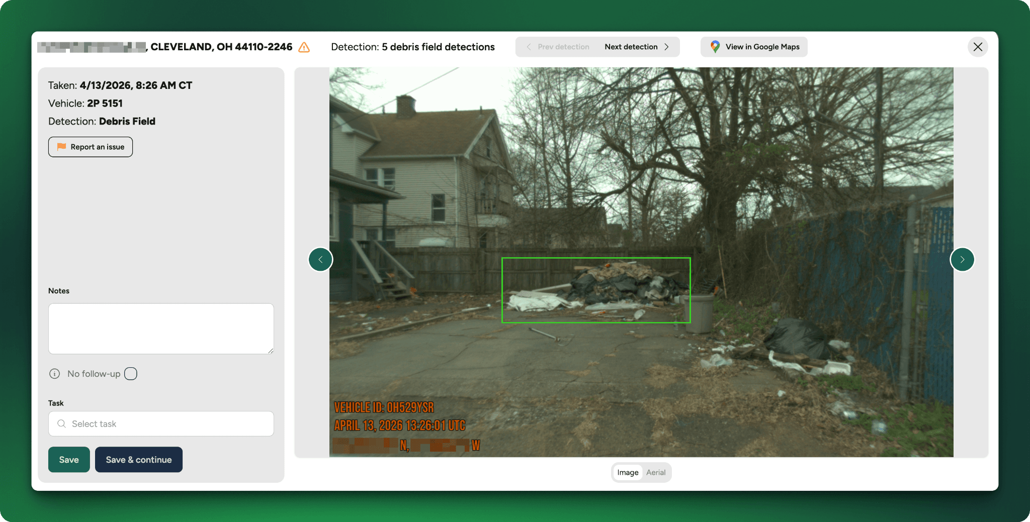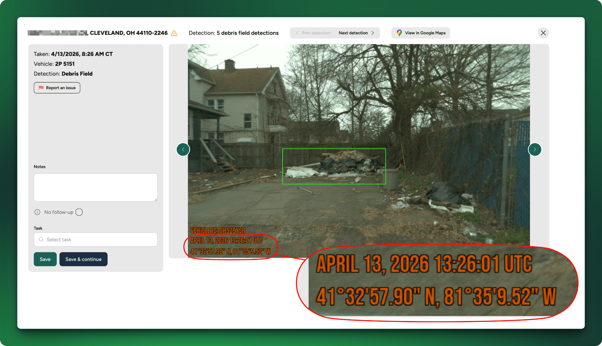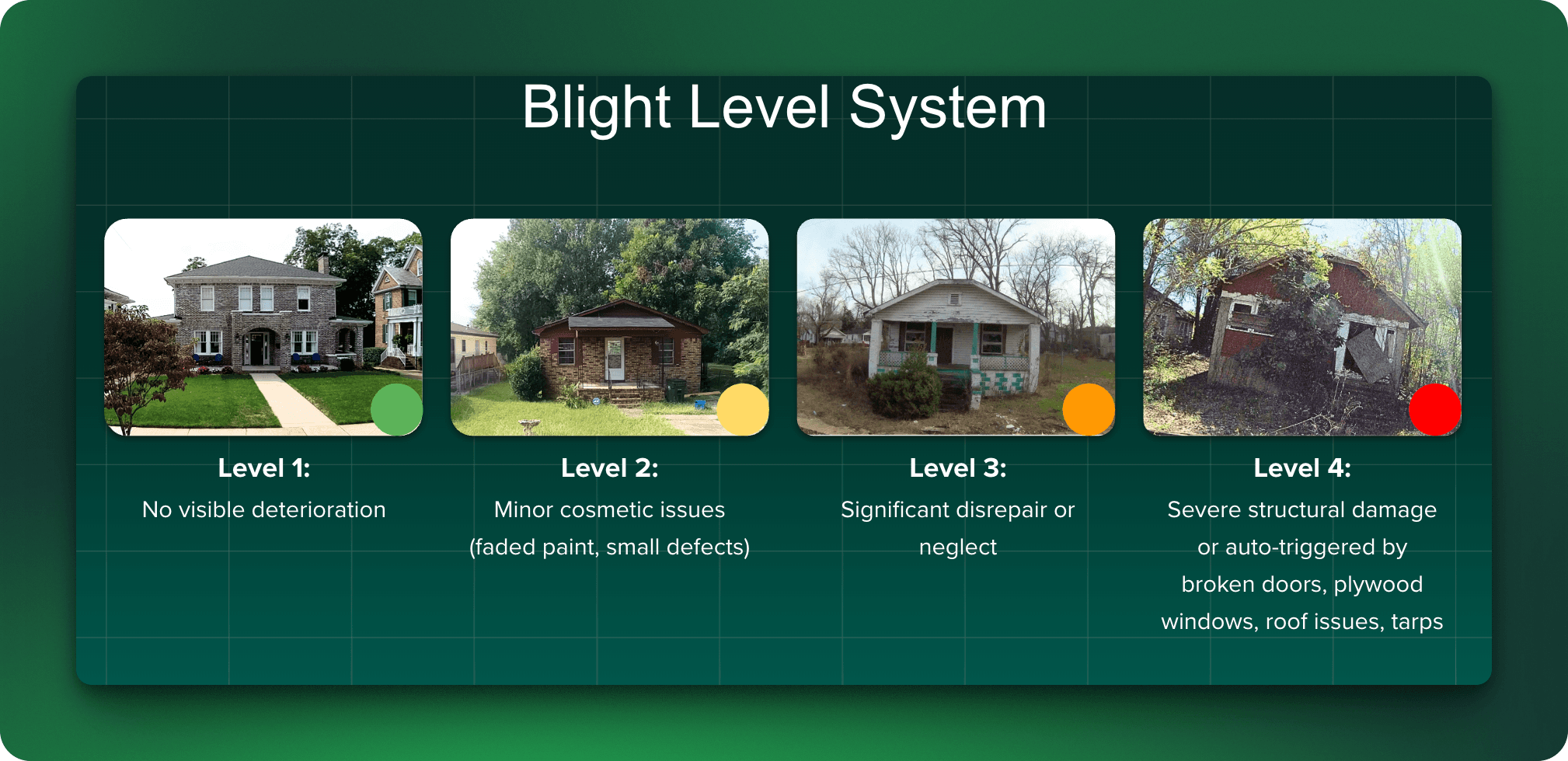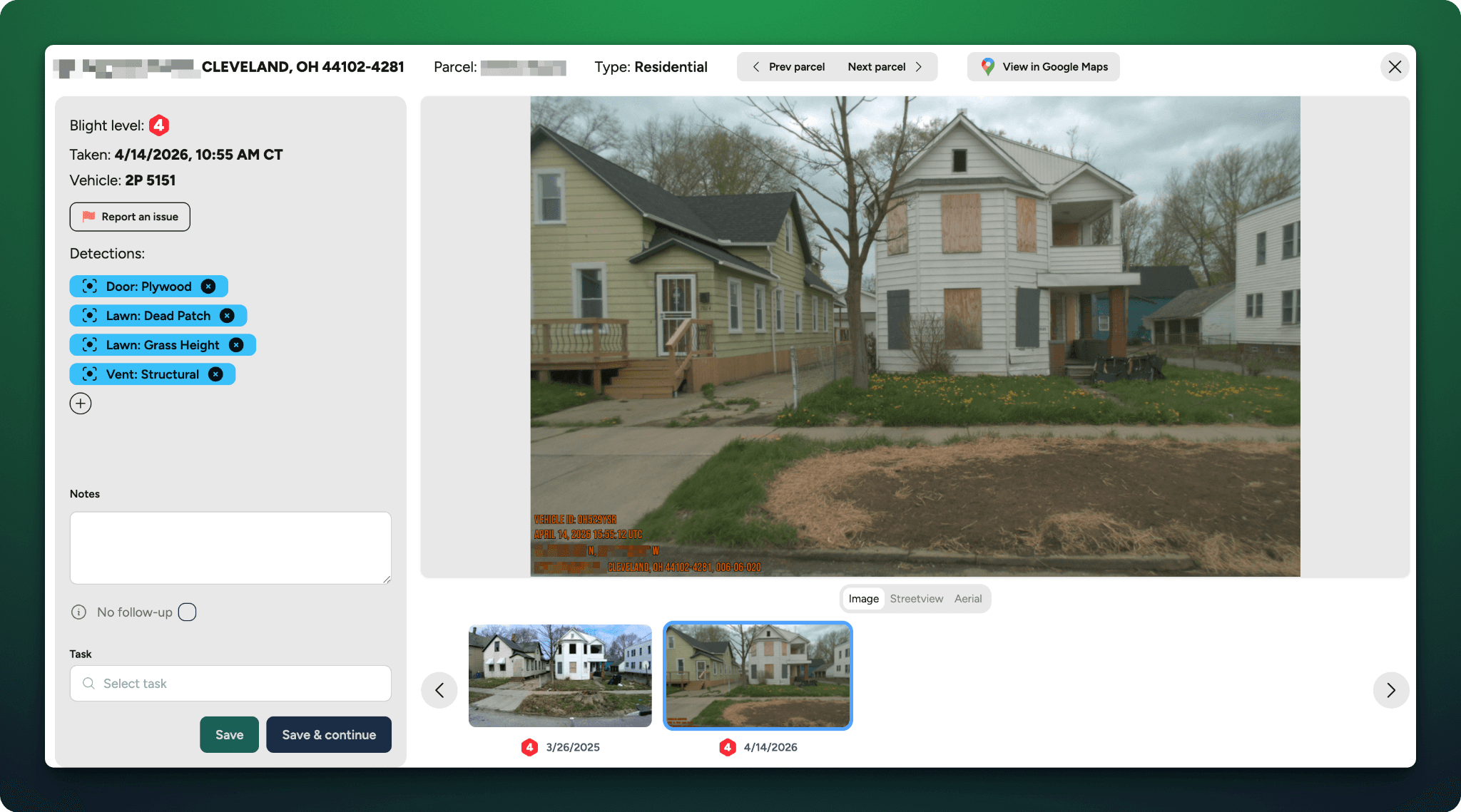 Every fleet route becomes an intelligence-gathering pass. Every image gets analyzed by computer vision trained to identify blight indicators, structural deterioration, storm damage, and code violations.